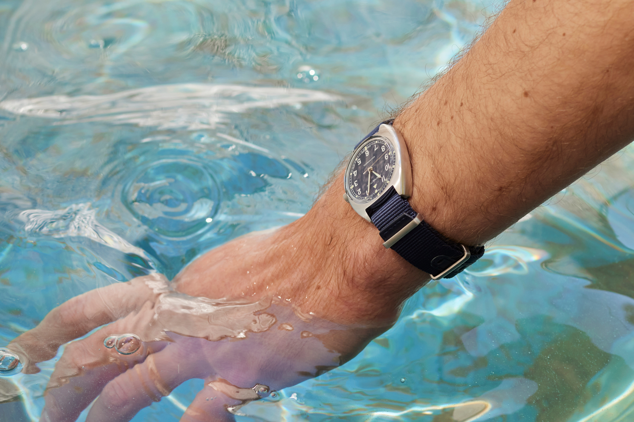 Switching to something a little more simple and utilitarian in aesthetic, I think this take on Hamilton's Khaki series deserves a bit more attention than it gets. While it might be a little straight to the point with its simple, legible, time-only dial, the slightly pebbled blue does make it feel a touch more relaxed, especially paired with the matching blue NATO strap that's perfect for warmer weather.